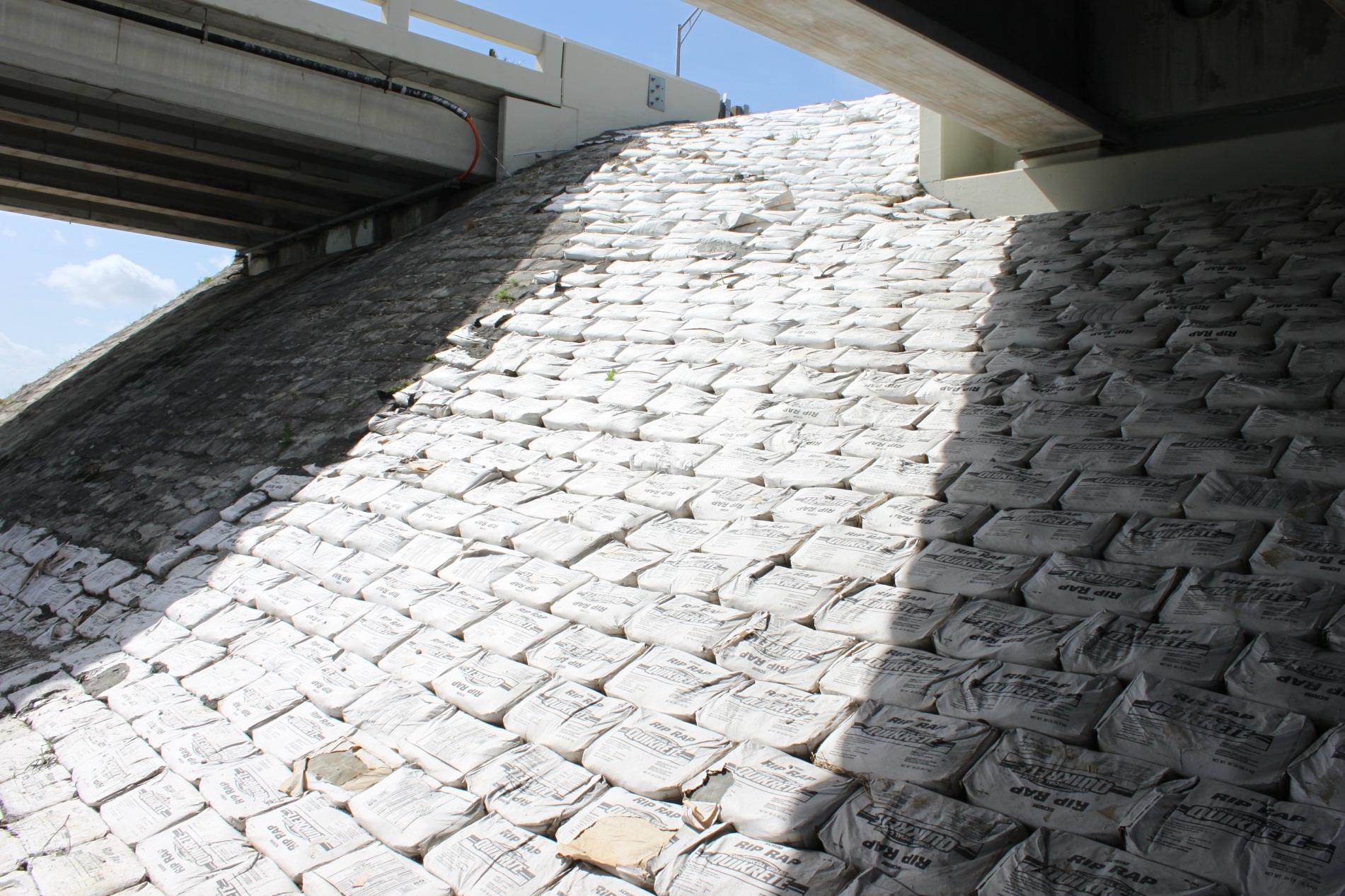 Das hatten wir bisher auch noch nicht gesehen. Um den Hang und den Weg um die Brücke zu befestigen, legen die einfach die kompletten Zementsäcke hin