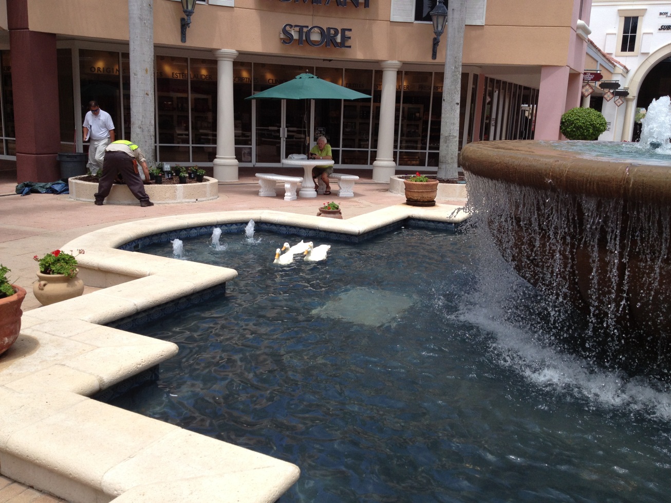 Diese kleine Gruppe Enten ist in einem Springbrunnen im Einkaufscenter eingezogen.